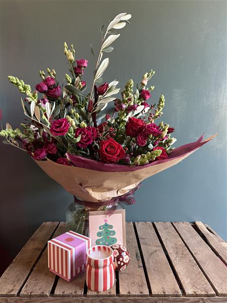 A Flower Hut Bundle - a curated gift bundle. A stunning vase of flowers, a scented ceramic candle, and card.