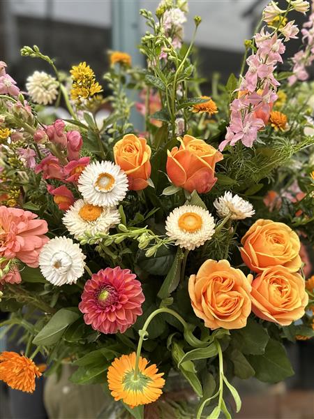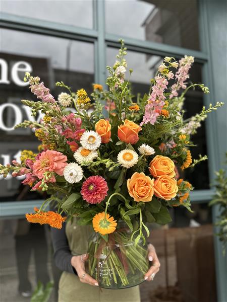 A vase full of zesty oranges and vibrant seasonal florals - our fave!