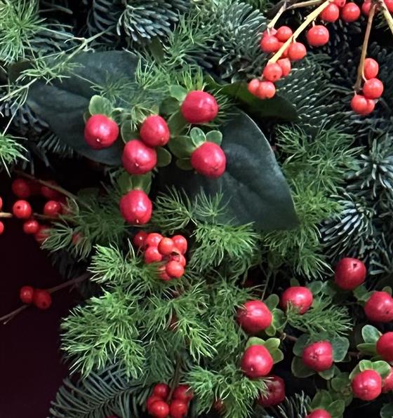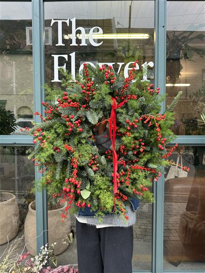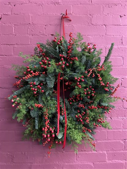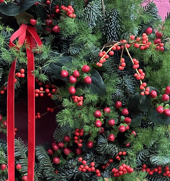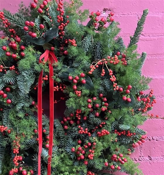 Our Flower Hut wreaths are created on a traditional moss base to keep your wreath well hydrated. We then handmake each design with seasonal foliage, soft blue Nordman spruce, and topped with complementary decorations and ribbon.
