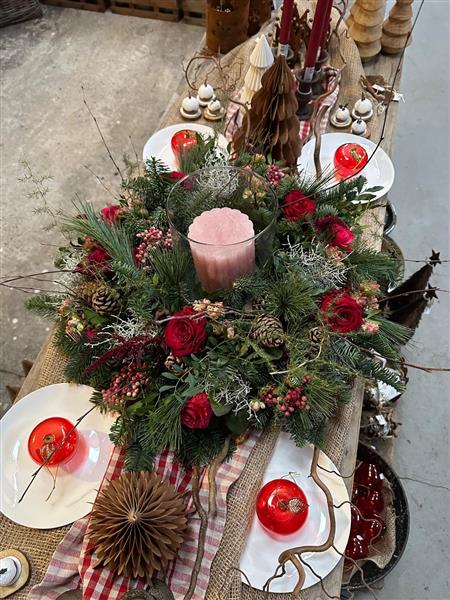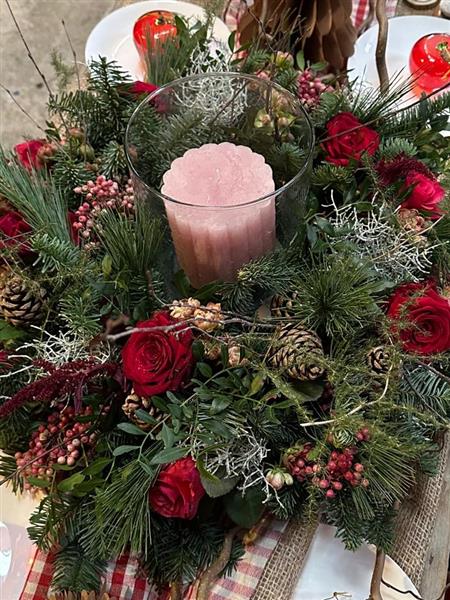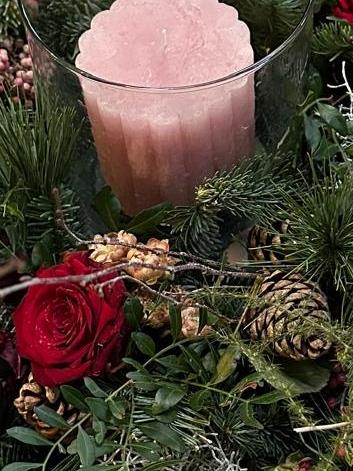From the Berry Berry Collection, a floral festive table centre with stunning scented red roses, peachy pink spray roses, and all the festive toppings.