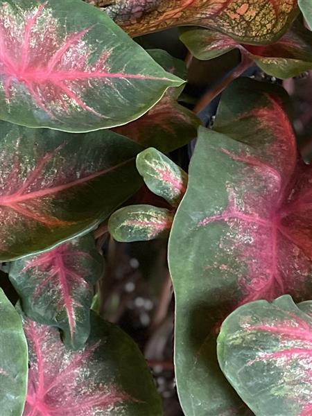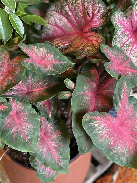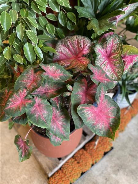 A stunning large caladium with striking colourful foliage. Native to South & Central America, this beautiful houseplant will love a well lit room out of direct sunlight & avoiding any draughts.