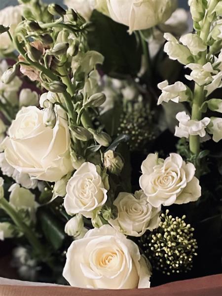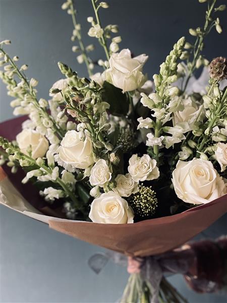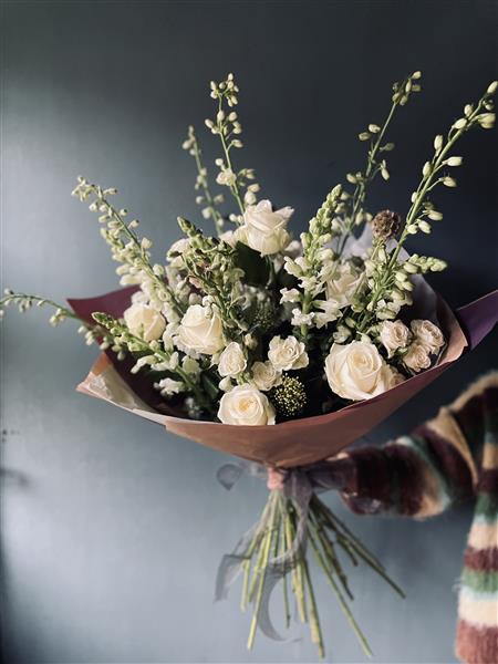 The Flower Huts delicate mix of seasonal flowers with beautiful roses arranged as a hand tied for collection or in an aquabox for delivery.