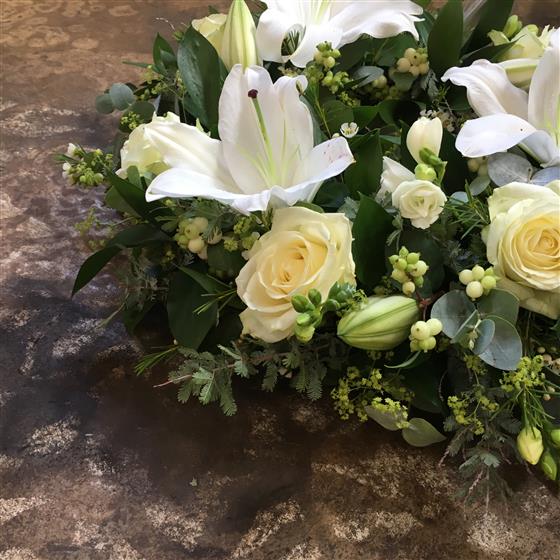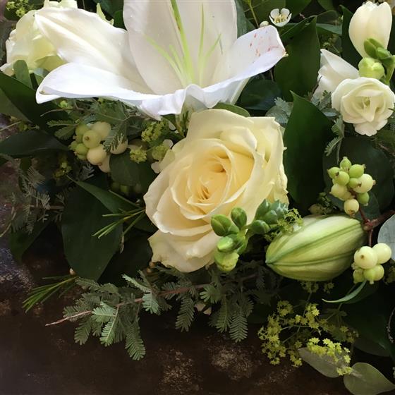 A classic wreath of fragrant lilies and complementary seasonal flowers