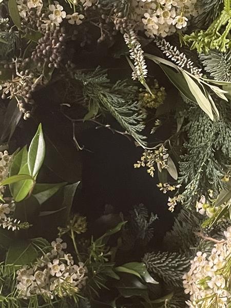 Our Flower Hut wreaths are created on a traditional moss base to keep your wreath well hydrated. We then handmake each design with seasonal foliage, soft blue Nordman spruce, and topped with complementary decorations and ribbon.