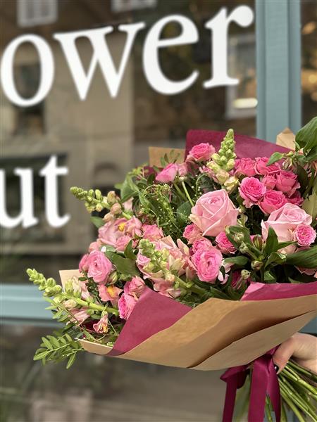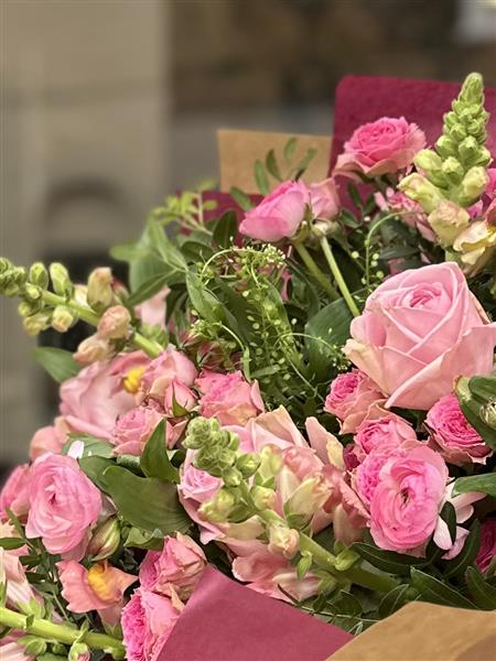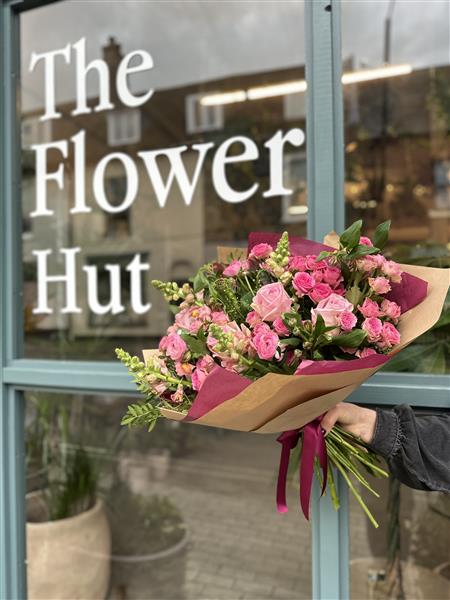 A pretty seasonal mix of pink flowers.