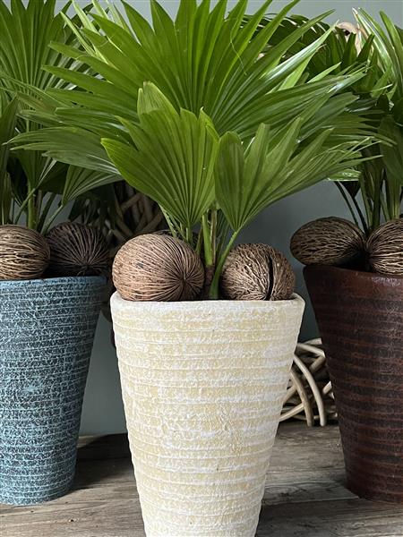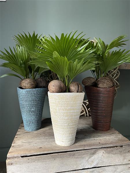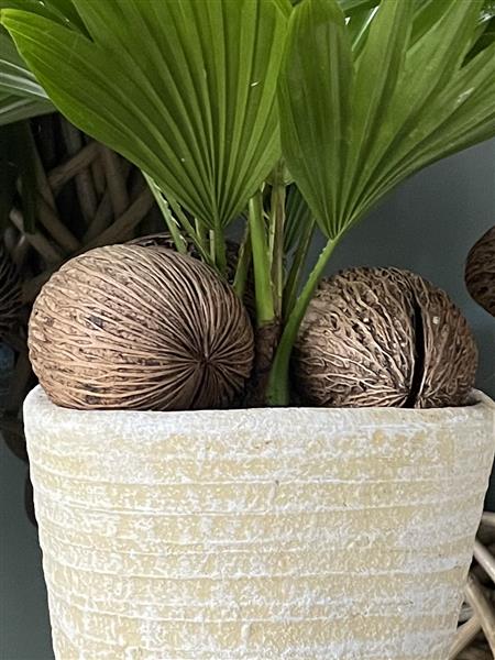 An ornate and striking footstool palm (Saribus rotundifolias) in an art-deco ribbed pot with ornamental seed pods.