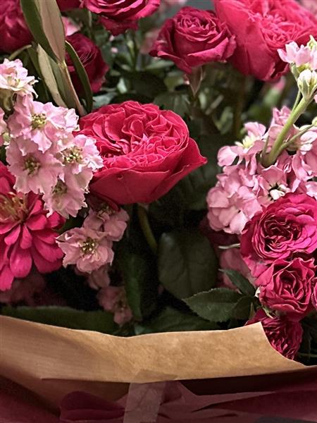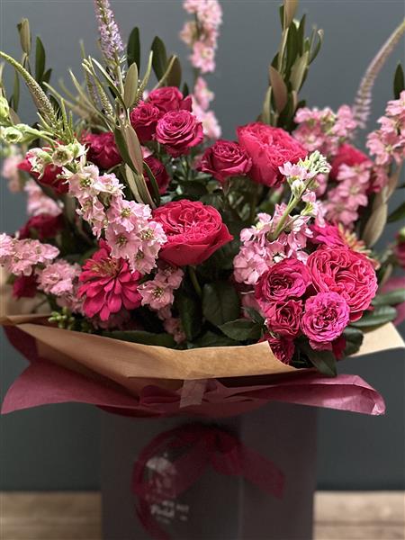 Undoubtedly one of our most popular bouquets, in stunning shades of pink and ruby. Arranged in an aquabox (unless vase stated).