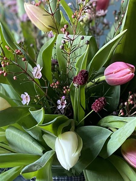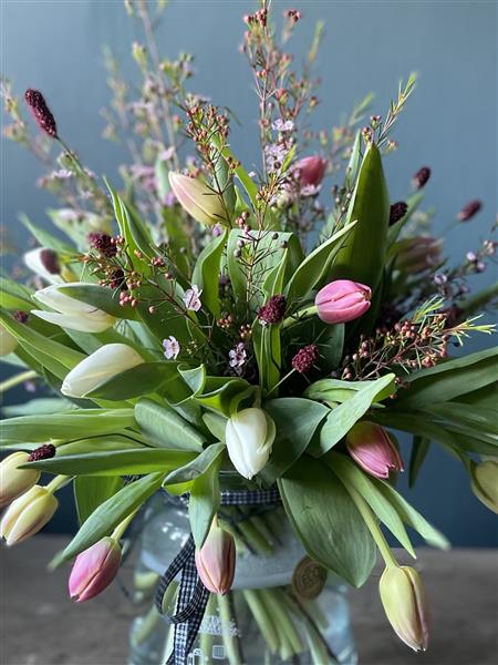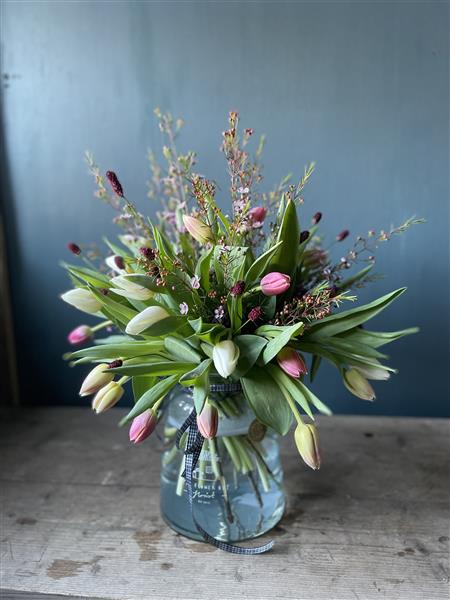 A seasonal mix of beatuiful fresh tulips & spring flowers, arranged in one of our eco recycled vases - completely packaging free!