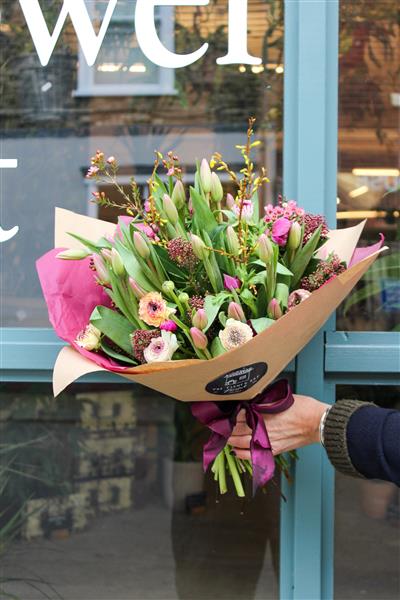 Arranged as a hand tied out of water for collection, or in a vase for delivery.
