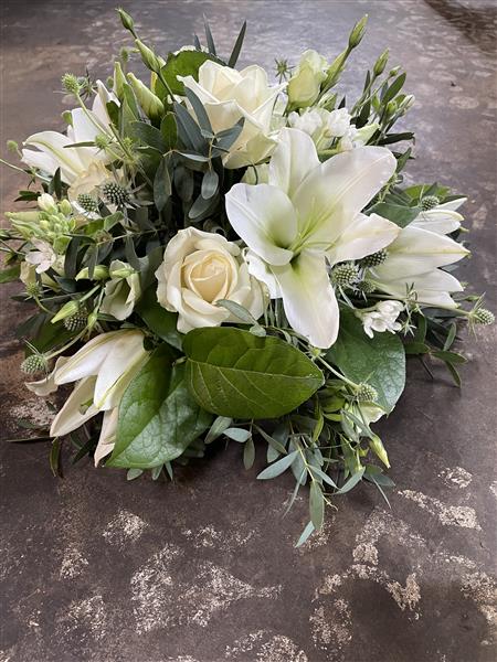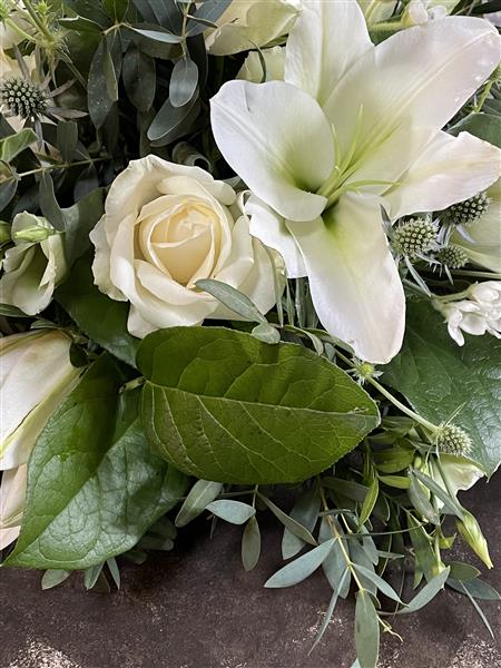 Stunning scented white lilies, complemented by soft white roses and seasonal foliage.
