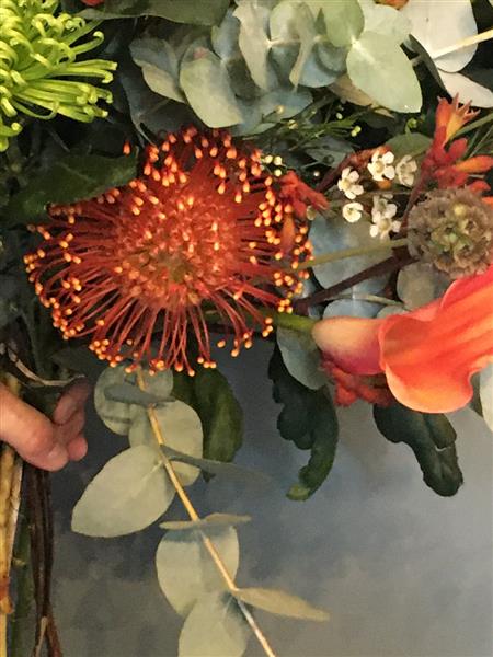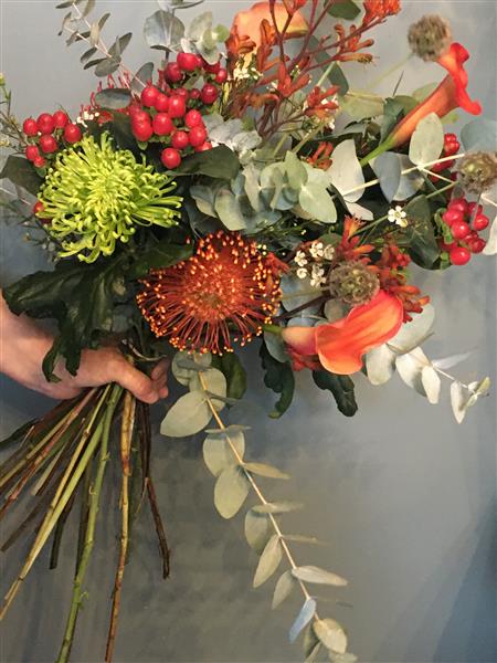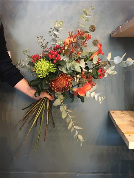 A stunning seasonal mix of vibrant limes and rich oranges, complemented by seasonal foliage and eucalyptus.
