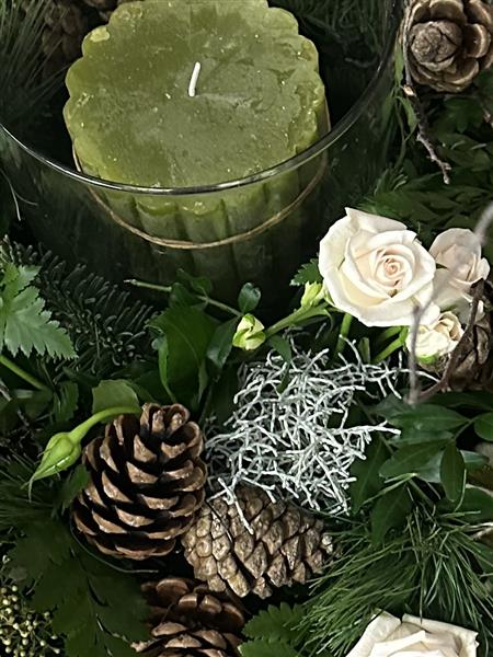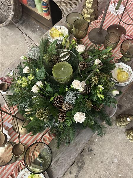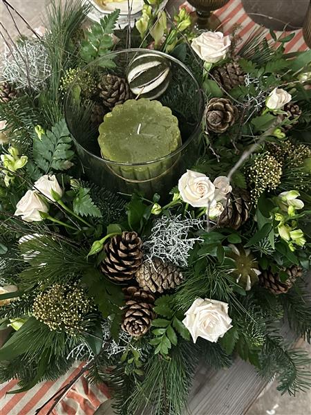 Pretty pastels roses and woodland style foliage, in a beautiful wreath to dress your festive table.